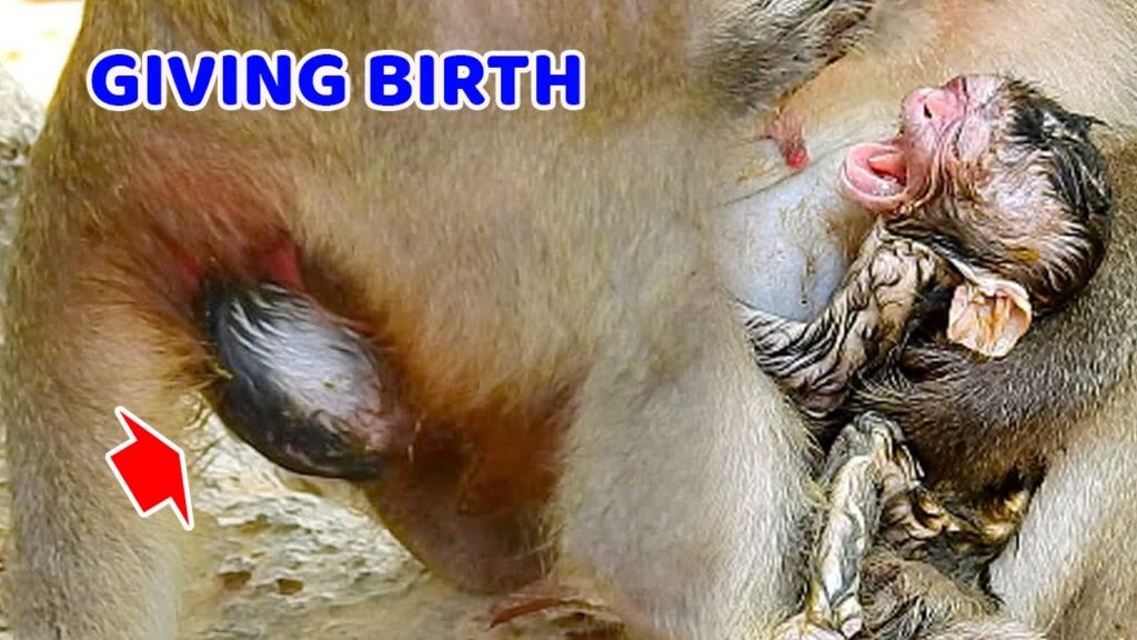 A joyful moment as a mother monkey happily celebrates the safe arrival of her newborn baby.
