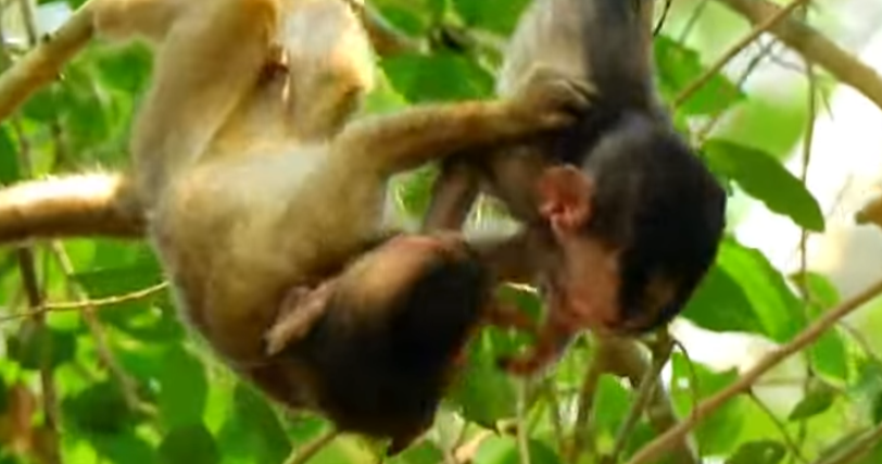 Her mother rushed down the tree in panic, her eyes wide with terror and love. She gently nudged Alba, lifting her carefully, as if the slightest pressure might break her child again. Alba’s breaths came short and shallow, her body shaking while she leaned against her mother’s chest for comfort. The troop gathered nearby, worried, restless, unsure what to do. Even the strongest monkeys seemed helpless in that moment.