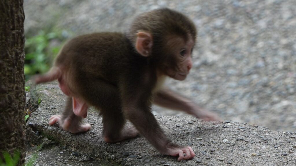 The video begins peacefully, with the mother grooming her baby in the warm sunlight. Their interactions are gentle and loving—tiny hands clinging to thick fur, soft vocalizations exchanged as reassurance. But peace in the macaque world can vanish in an instant. Without warning, an adult macaque from a rival group approaches, seizing the infant with astonishing speed. Panic erupts.