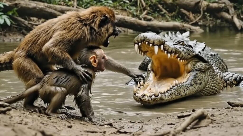 The young monkey froze in fear. Panic spread through the troop. Screams echoed from the trees. But one scream rose above the rest—the desperate cry of his mother. Without hesitation, driven by pure love and instinct, she raced toward him. She knew the danger. She knew the power of the crocodile. Yet, nothing mattered more than her child.