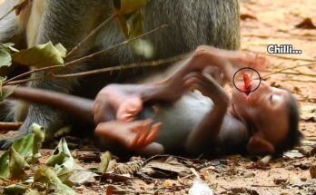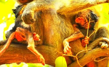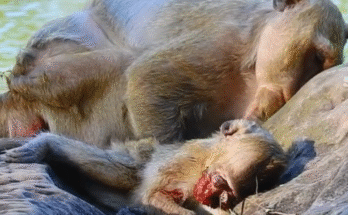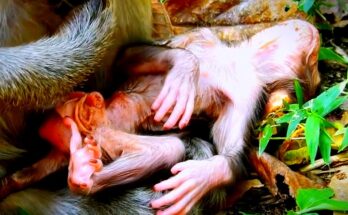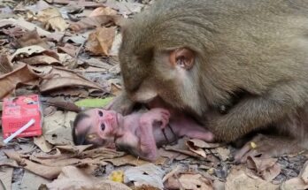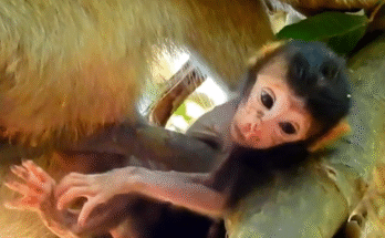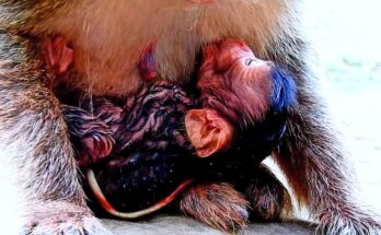 Oh God—a young mother monkey clumsily hugs her newborn, showing clear inexperience mixed with deep worry. The tiny baby is still unfamiliar to her, warm and fragile, clinging instinctively to …