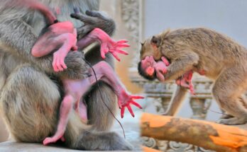 Oh God—a young mother monkey clumsily hugs her newborn, showing inexperience and worry. Read More