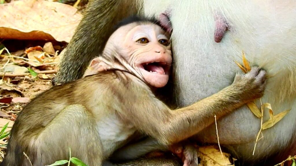 Mother monkey Jynly sits quietly, cradling her son Jamy in her arms, her movements gentle and deliberate. The forest around them hums with life, yet in this moment, only the bond between mother and child seems to matter. Jamy nestles close, instinctively seeking warmth and nourishment, his tiny hands clutching at Jynly’s fur. Each suckle brings comfort, strength, and the reassurance of safety.