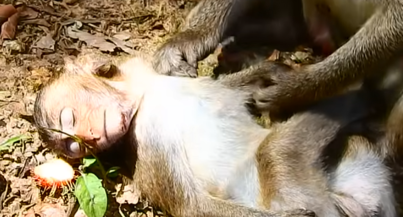 A few monkeys turned back to look at him. Some approached, curious at first, then worried when they saw him struggling. Leo tried to stay strong. He tried to sit upright, tried to pretend everything was okay. But he couldn’t hide the pain that slowly tightened around him. Maybe the food was spoiled. Maybe something poisonous touched it. Or maybe his stomach was too empty for too long, and the sudden meal shocked his fragile body.