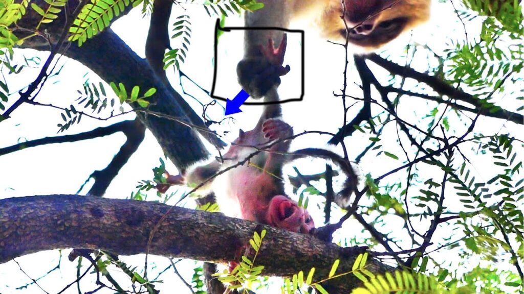 The video opens with the tiny newborn clinging weakly to a high branch. Still new to the world, the baby can barely lift its head, let alone understand what is happening around it. Its soft cries echo gently through the forest—a sound that instantly touches the hearts of viewers. The little one instinctively reaches out, searching for warmth, comfort, and the familiar touch of its mother.
