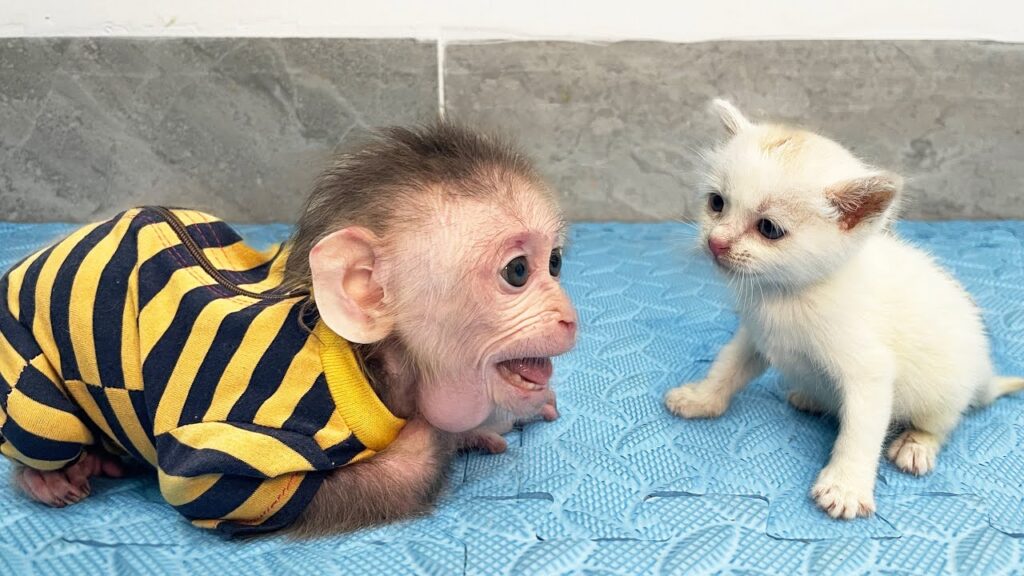 Monkey Junbi Meets Newborn Kitten For the First Time!, viewers are invited to witness one of the sweetest and most innocent encounters in the animal world. Junbi, a curious and playful young monkey, discovers a tiny newborn kitten whose eyes have only just opened. What follows is a gentle, emotional, and unbelievably adorable moment as two completely different species share their first interaction.