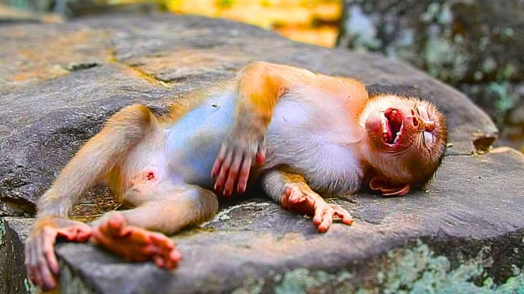Bayi monyet ini terlihat sangat lapar. Ia mencoba mencari sesuatu untuk digigit—daun, ranting kecil, atau bahkan tanah—namun tidak ada yang bisa mengisi perut kecilnya. Raut wajahnya menunjukkan rasa sakit dan kelelahan. Setiap kali ia mencoba berdiri, tubuhnya goyah dan hampir jatuh kembali. Kelaparan dan kurang tidur membuatnya sangat lemah.