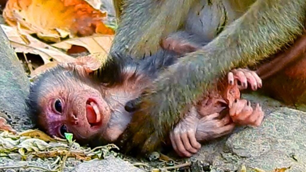 By pure fortune, the baby survives. Leaves break the descent, and a final branch slows the impact just enough to spare a life still learning how to cling. The newborn lies stunned, tiny chest fluttering, shock written into every shallow breath. For a moment, the forest holds its silence.